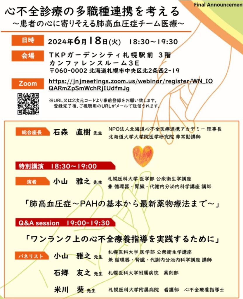 本セミナーは医療専門職でしたらどなたでも無料でご視聴いただけますが、事前参加登録をお願いしております。下記フライヤーのQRコードあるいはURLよりご登録ください。皆さまのご参加をお待ちしております。